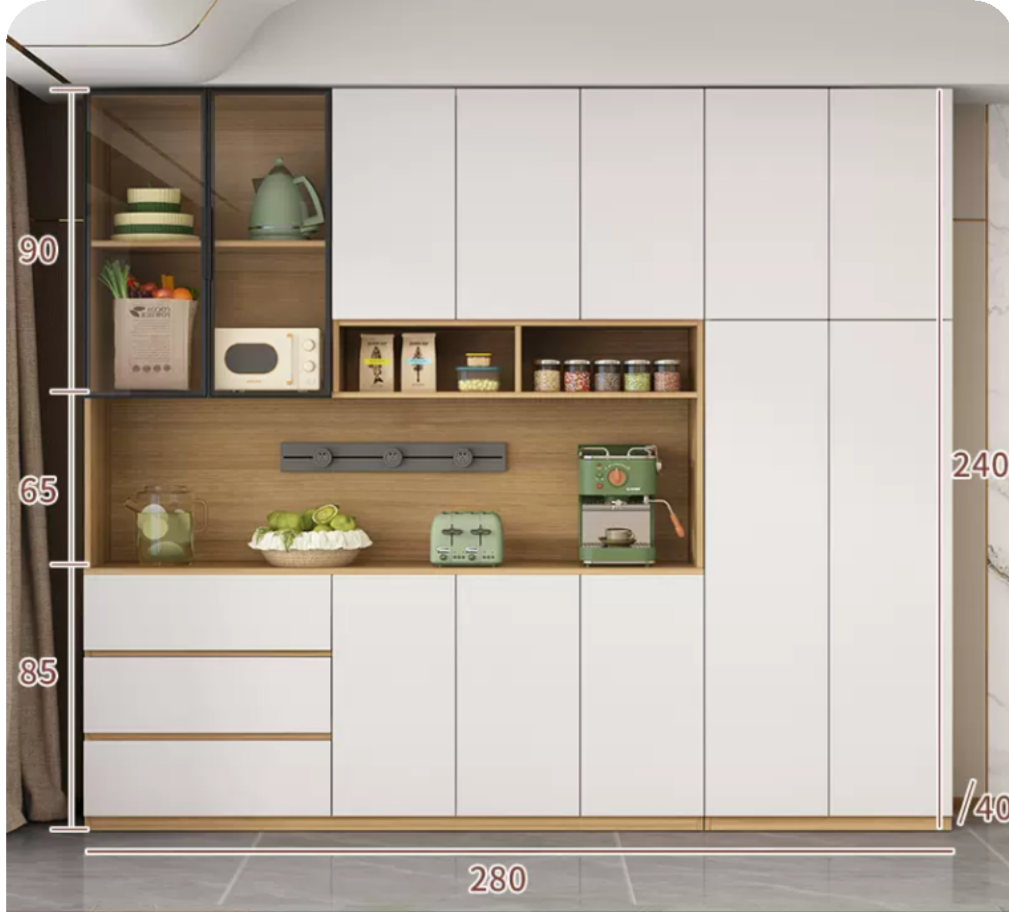 The transparent tempered glass doors with durable aluminum frames provide clear visibility and easy access to stored items. The elevated top cabinet maximizes vertical space while keeping dust out??ideal for storing groceries, spices, and more. The wide countertop allows for comfortable use and clutter-free organization. Deep drawers equipped with premium silent rails ensure smooth operation and enhanced load-bearing. A sleek push-to-open handle-free design with built-in rebounders offers convenience and safety, while the raised baseboard improves stability and resists moisture and dust.